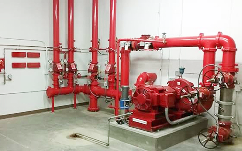 Fire sprinkler system detect, control and extinguish a fire, and warn the occupants of occurrence of fire. The installation comprises fire pumps, water storage tanks, control valve sets, sprinkler heads, flow switches, pressure switches, pipe work and valves.